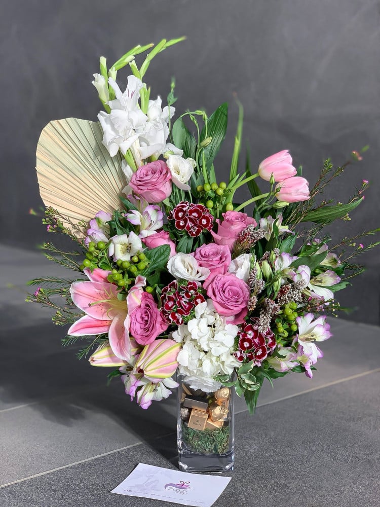 مجموعه من الورود على فازه مع حلاوه باتشي
