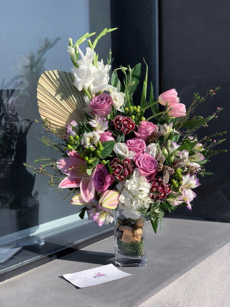 لو تدور على هدية حلاوة باتشي مع ورد تجمع بين جمال الورد الطبيعي وطعم الحلاوة اللذيذ، فازة الورد مع حلاوة باتشي بتكون خيارك المثالي. تنسيق الورد هنا محترف ويعكس ذوق راقي، والتغليف يضيف لمسة فخمة ترفع من قيمة الهدية.