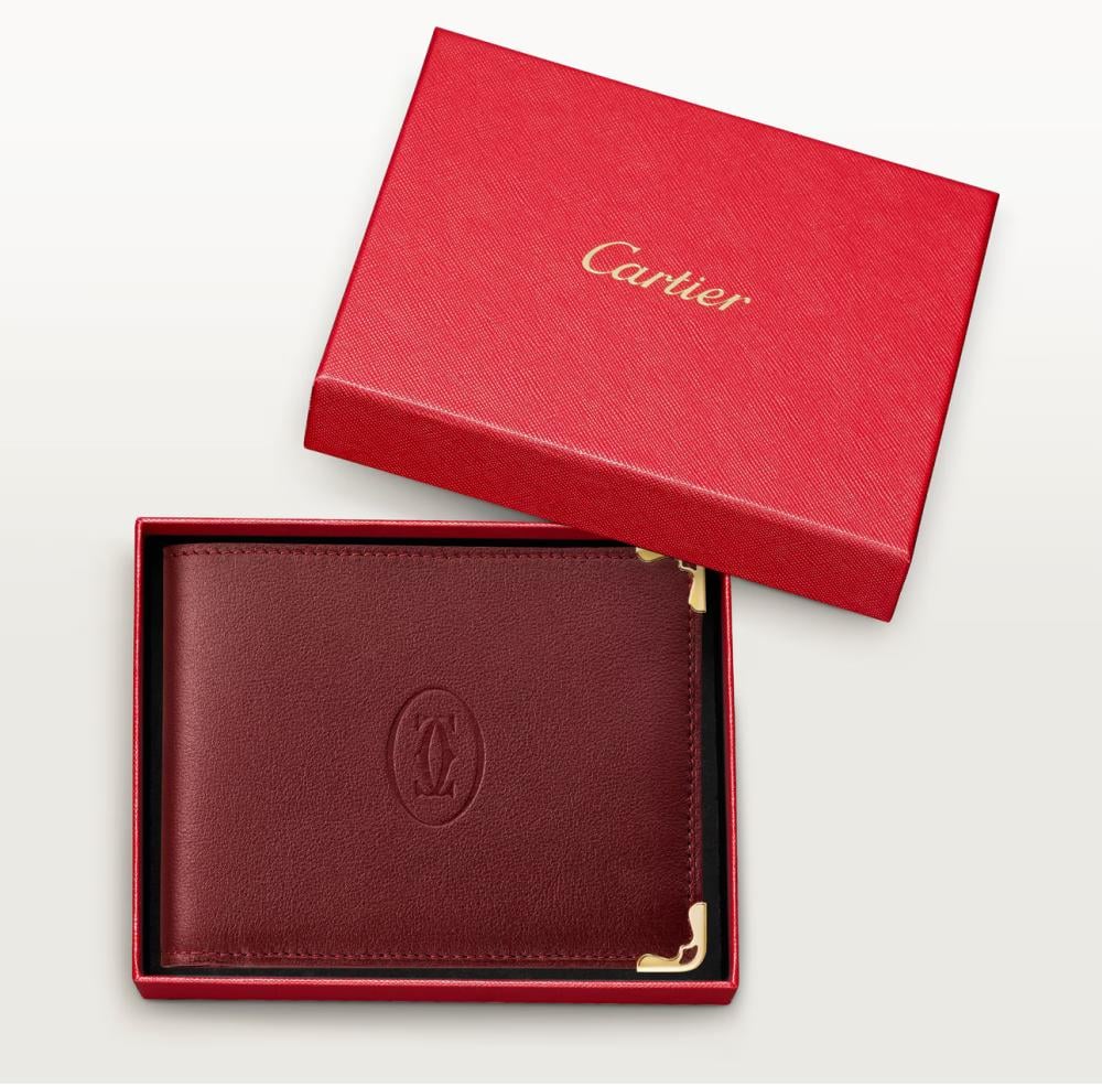محفظة بـ 6 جيوب بحجم بطاقات الائتمان، مصنوعة من جلد العجل باللون الخمري. من الخارج: شعار حرف "سي" المزدوج ناتئ، وزوايا معدنية مطلية باللون الذهبي. من الداخل: جلد العجل باللون الخمري، ونقش "كارتييه" باللون الذهبي، و6 جيوب بحجم بطاقات الائتمان، وجيبان للأوراق النقدية. المقاييس: الارتفاع 91 مم x العرض 119 مم. يمكن صنع هذه الوحدة في إيطاليا أو في البرتغال